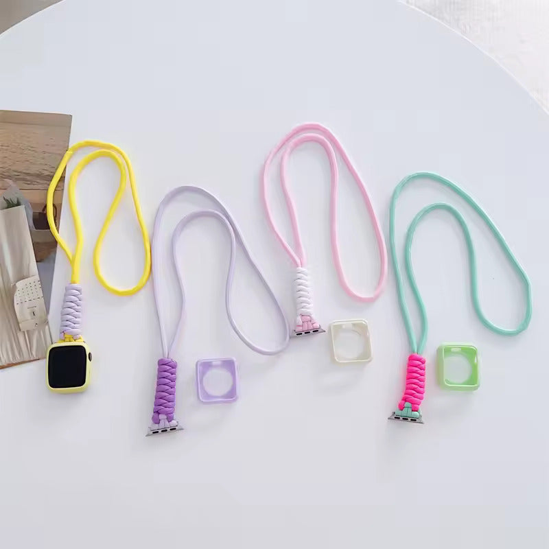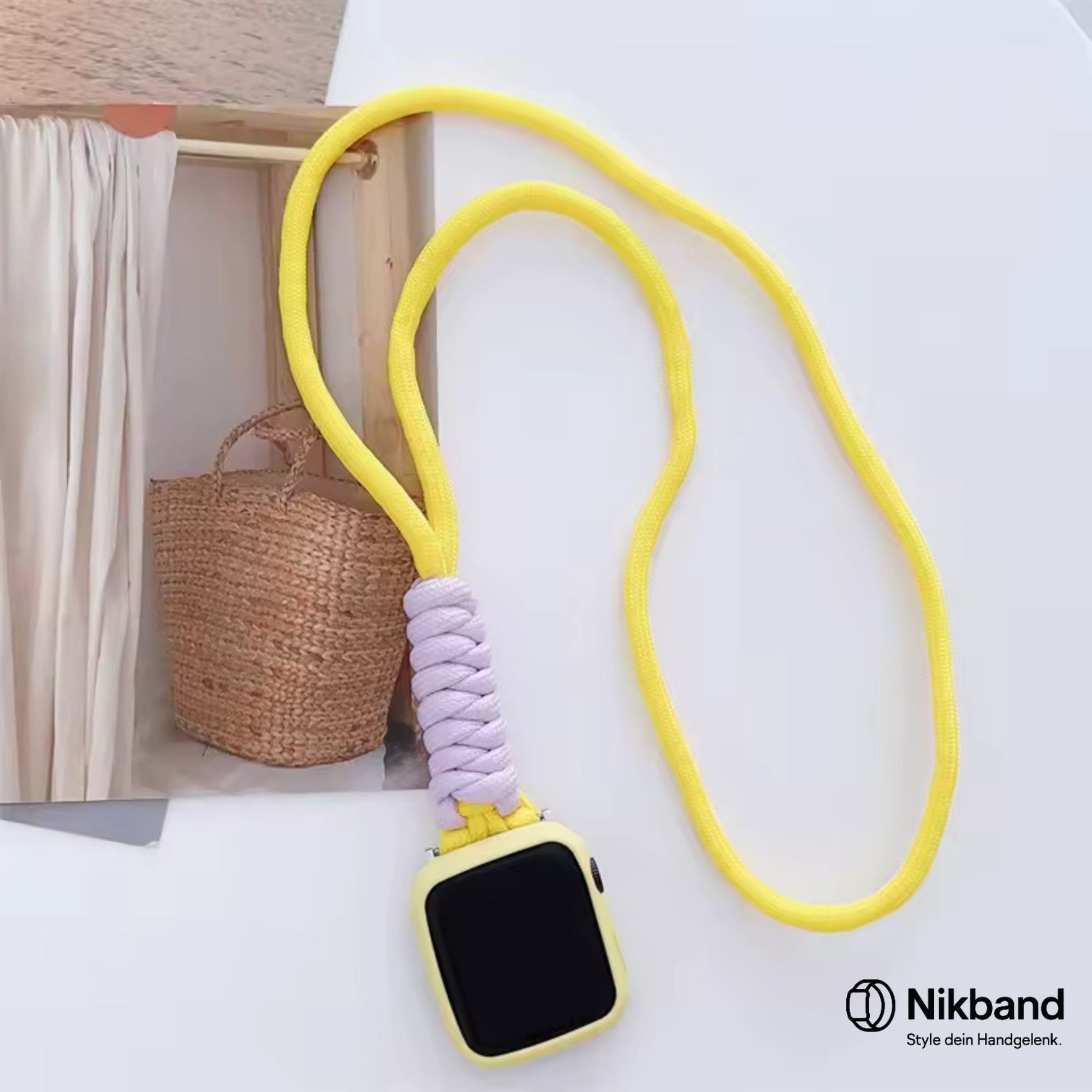 Mit der Zeitkette trägst du deine Smartwatch nicht am Handgelenk, sondern stylisch und sicher wie eine moderne Taschenuhr. Das weiche Silikon-Case schützt dein Gerät, während das bunte Crossbody-Band aus Stoff für Tragekomfort und Style sorgt.